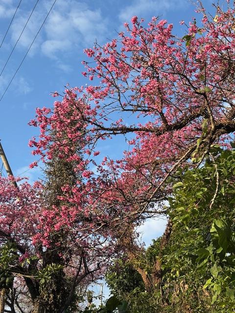 沖縄は桜満開ですが ひと風吹いたら花も落ちそうです。 観光の皆さんはお早目にねー